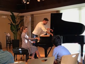 Pianist and composer, Randall Faber, came to coach his trio “Three Characters” for violin, viola and piano. Then allcampers gathered to listen to the composer explain how he conceived the piece and give some insights on what sound and expression he was looking for in each of the three movements.